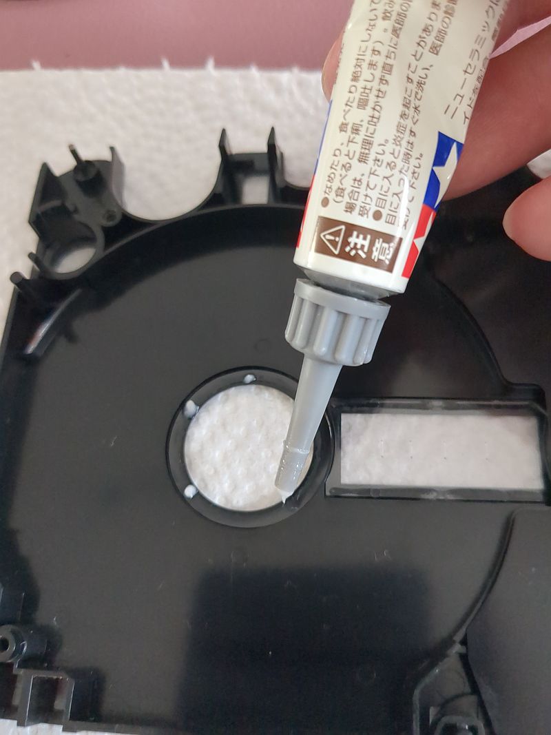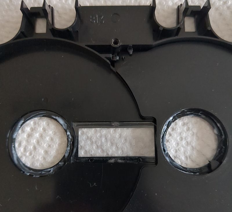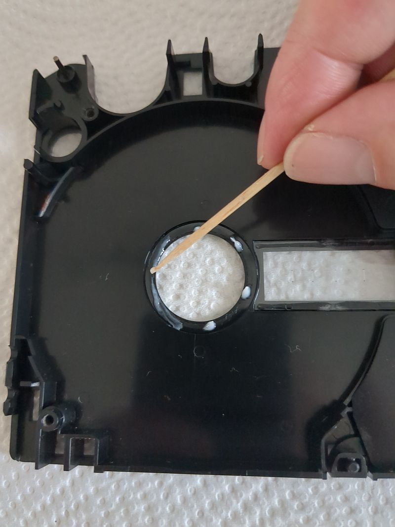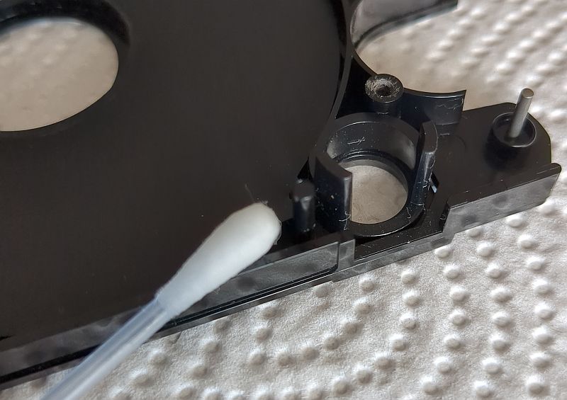 Mit dem Zahnstocher wird das Fett verteilt: Das sieht dann so aus: Die zerlegte Cassette im Überblick (hier ein 2 x 45 Minuten-Wickel und orangen Löschlaschen): Beim Einlegen des Bandwickels muss das Band an diesem Pin außen vorbei geführt werden: Nach dieser Auffrischungskur „schnurren“ die Elcaset-Cassetten wieder wie ein Kätzchen! Nein, eigentlich laufen die Cassetten nun geräuschlos! | ||