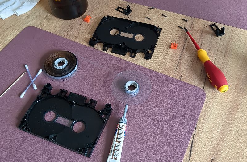 | Diagnose | Wie sich herausstellte, lag das Rattern der Cassette gar nicht am Gerät! Denn nicht alle Cassetten ratterten gleich extrem. Manche Bänder liefen auch fast geräuschlos, andere wiederrum ratterten nicht nur, sondern der rechte Bandwickel blieb - wie bei der hier beschriebenen Cassette - stehen! |
