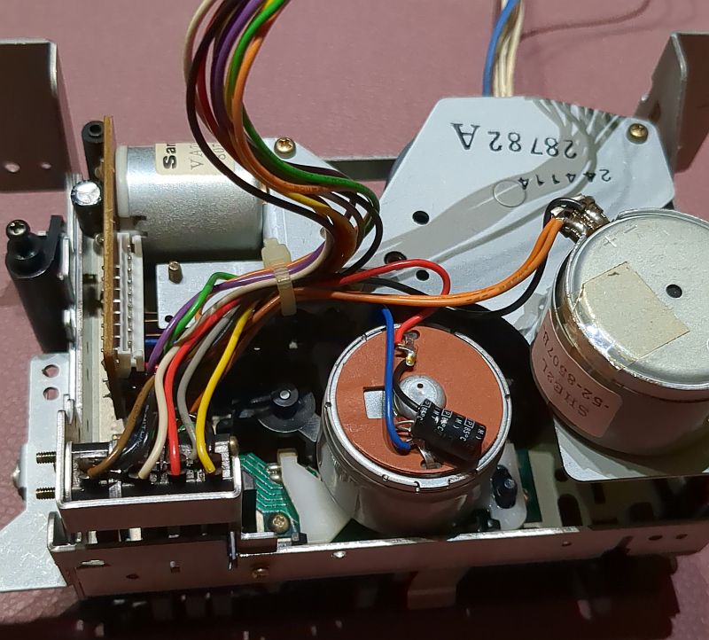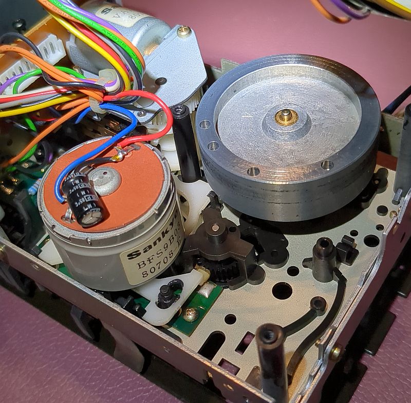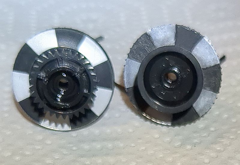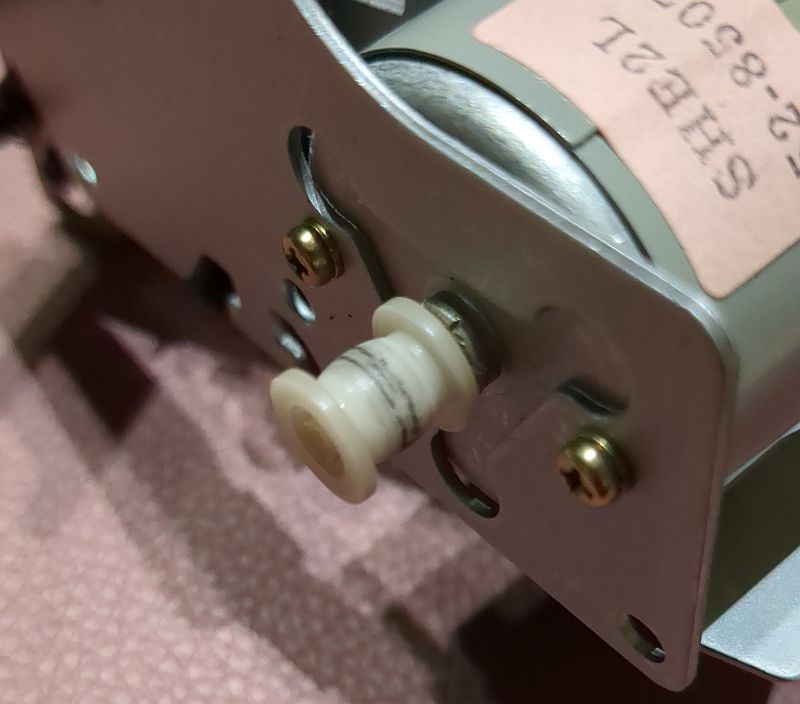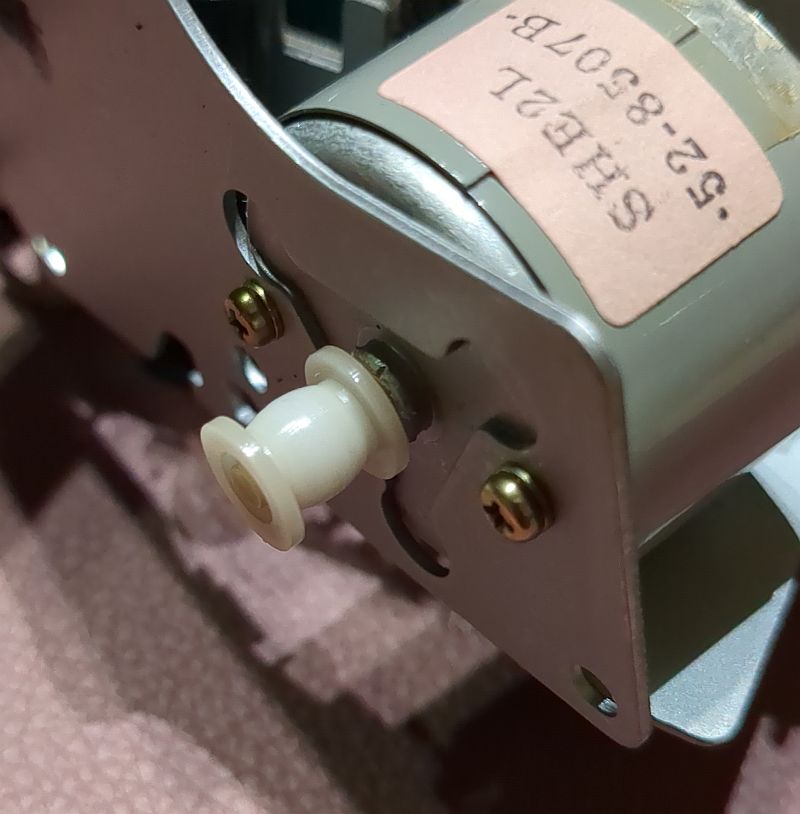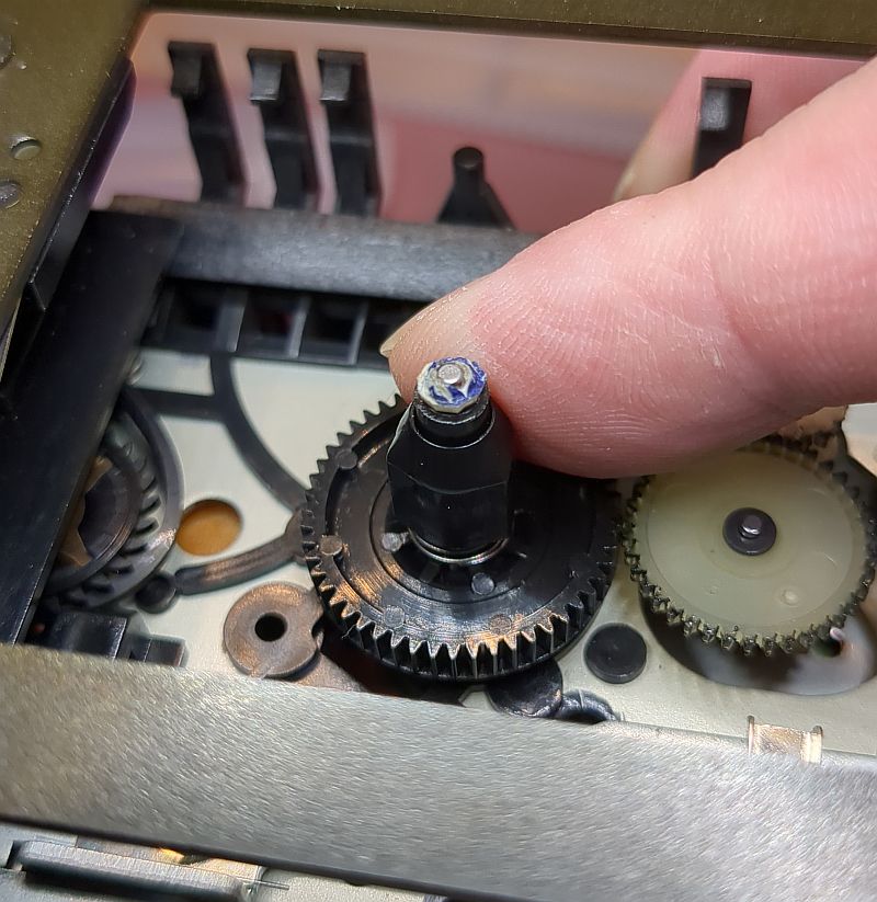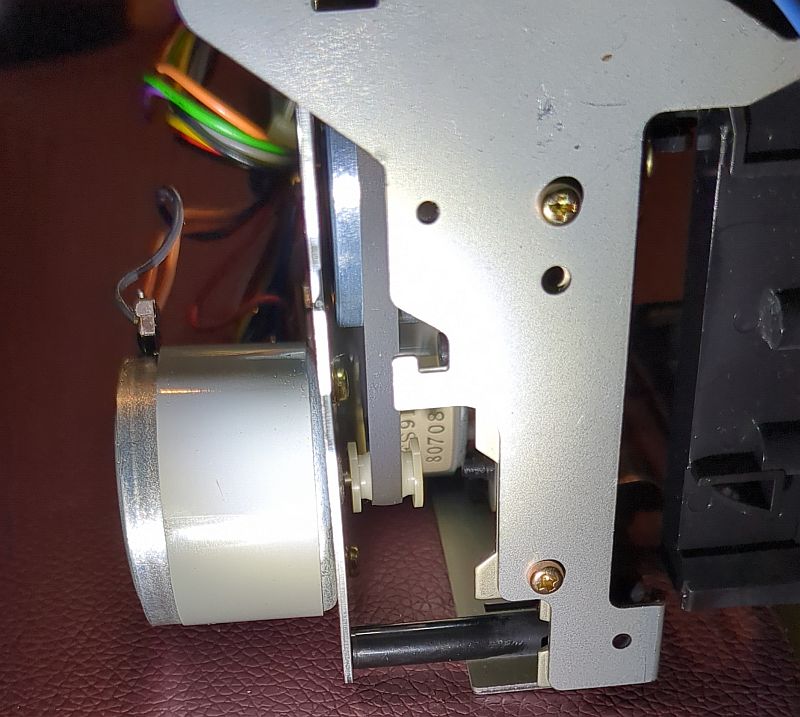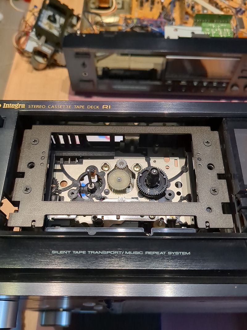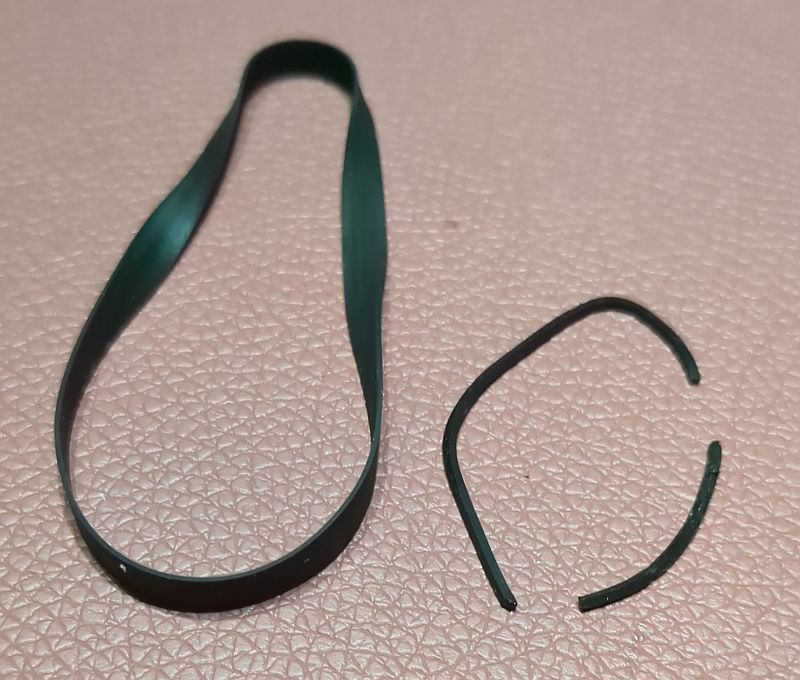 | Problem | Im Herbst 2024 hatte ich mir über den Kleinanzeigenmarkt ein Onkyo TA-2550"an Land gezogen". Dabei handelt es sich um das „kleine“ Schwestermodell des TA-2570. Es sollte eigentlich als "Ersatzteil-Träger" dienen und ich wollte den linken Wickelteller für mein 2570 verwenden, da dort ja die "Riemenpest" die Reflexionsfelder beschädigt hatte und ich diese nachschwärzen musste (siehe dazu den Bericht zum TA-2570). Auf dem Bild unten sehen wir im Vordergrund das Laufwerk des 2550. Dort ist der Wickelteller bereits ausgebaut. Im Hintergrund das 2570 mit (mal wieder) ausgebauten Laufwerk. Wie sich herausstellte, war auch hier der Backtension-Riemen am Ende seiner Haltbarkeit angekommen! Allerdings hatte er sich noch nicht „verflüssigt“ und konnte daher zum Glück keine Sauerei im Gerät verursachen! Wie sich jedoch ebenfalls herausstellte, passt der Wickelteller aus dem 2550 nicht in den 2570! Links der Wickelteller des 2550, rechts der des 2570 Das gesamt Laufwerk ist als Single-Capstan-Gerät insgesamt viel einfacher „gestrickt“. Hier sehen wir nach dem Ausbau des Antriebmotors die einzige Schwungmasse in diesem Gerät (mit Gummianhaftungen des Antriebsriemens): Die „Riemenpest“ hatte also auch bereits den Antriebsriemen befallen! Sofortiger Austausch war daher dringend angeraten!Auch am Motor-Pulley (natürlich beim 2550 nur ein Plastikteil; im 2570 ist der aus Messing gefertigt!) sind schon Anhaftungen des Riemens vorhanden: Links liegt der schlappe Antriebsriemen, rechts nochmals der Backtension-Riemen: Auf diesem Foto ist das Flywheel (Schwungmasse mit Capstan) bereits gereinigt. Es sind noch Lauf-Spuren und auch kleinere Pickelchen (Zinkpest) erkennbar. Der Plastik-Pulley ist auch wieder sauber und kann nun wieder den Riemen antreiben: So ist der Riemen "ordentlich aufgelegt"... Durch die Wölbung (den Bauch) des Pulley wird der Riemen „automatisch“ in die Mitte getrieben und dort gehalten. Dummerweise ist mir beim Befestigen des linken Wickeltellers die kleine und hauchdünne Befestigungsscheibe „flöten gegangen“, die auf die Achse geclipst wird!Ersatzweise musste ich mir daher aus einem Margarine-Dosen-Deckel eine alternative Befestigung basteln. Tatsächlich funktioniert das so problemlos! Auf dem rechten Foto sieht man übrigens auch den neu aufgezogenen Backtension-Riemen: Das TA-2550 ist tatsächlich als Zweitgerät im „produktiven Einsatz“ (wird also als Cassetten-Spieler genutzt). Zum „Schlachten“ ist das Deck dann - trotz der Abstriche - doch „zu gut“!
