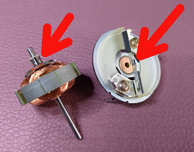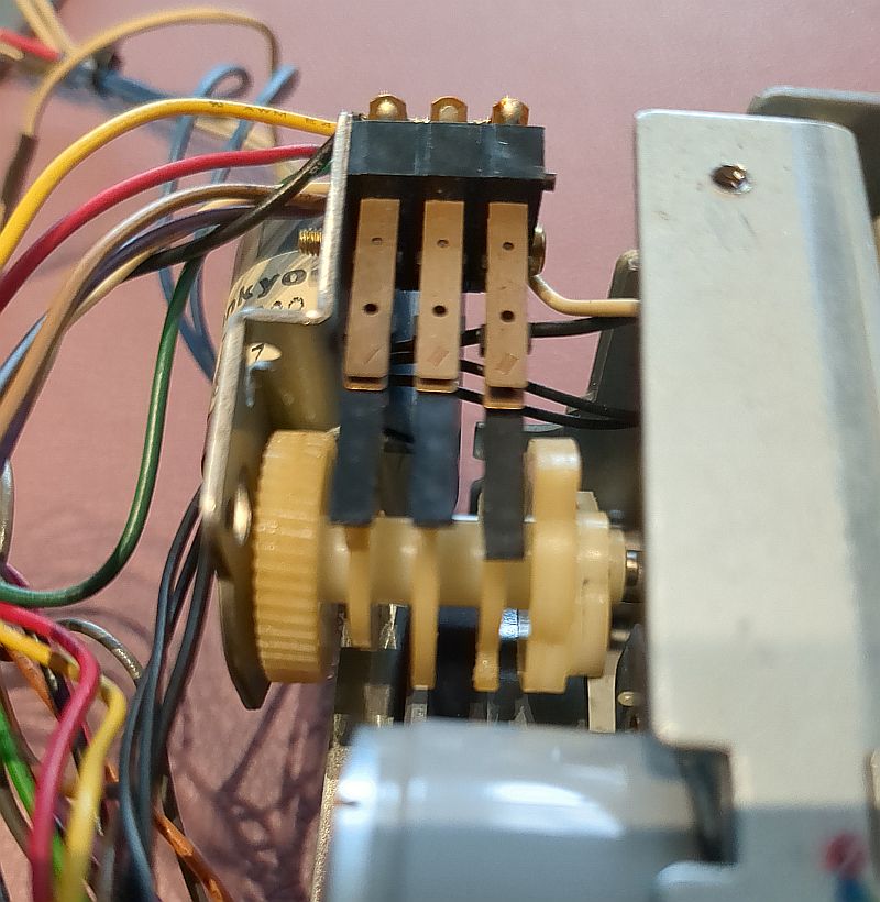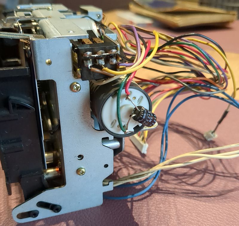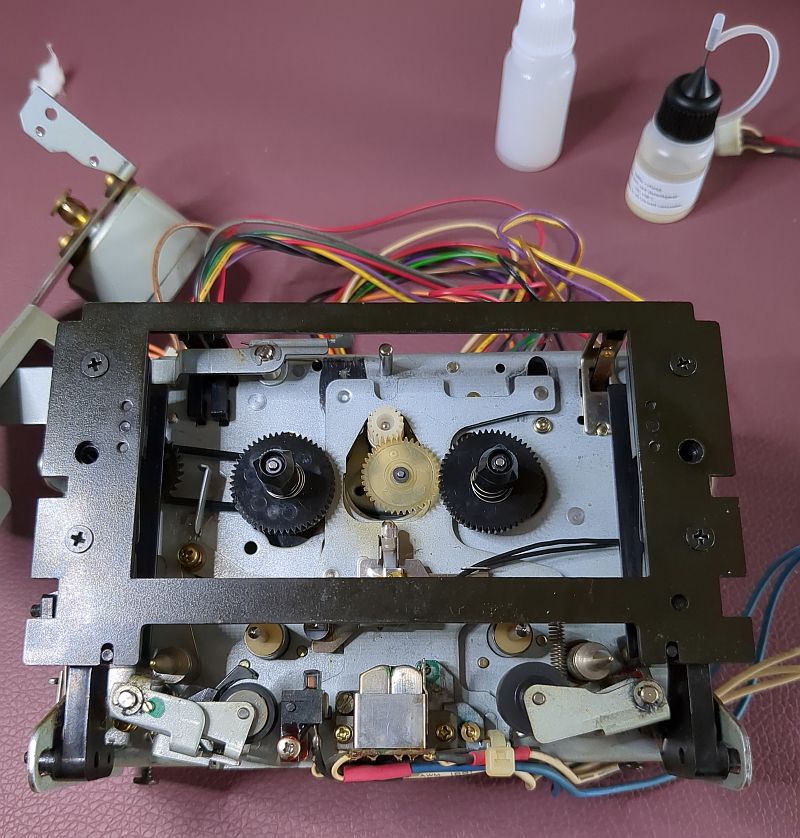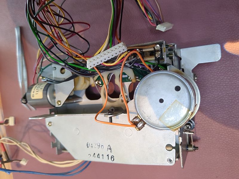 Ich hatte schon den unten zu sehenden Assist-Motor (Hub-Motor) in Verdacht, der die Tonkopfbrücke anhebt und die Laufwerkslogik steuert. Aber der drehte einwandfrei. Dann vielleicht doch „nur“ die Kontaktlaschen, die über die vom Assist-Motor angetriebe Nockenwelle auch die Laufwerkslogik bewerkstelligen? Und tatsächlich: Nach der Reinigung der Kontaktflächen funktionierte das Deck wieder einwandfrei!
