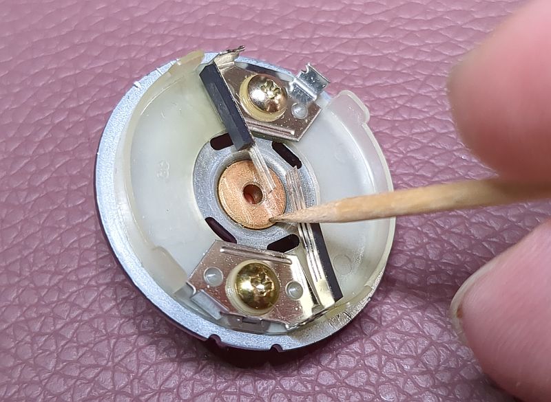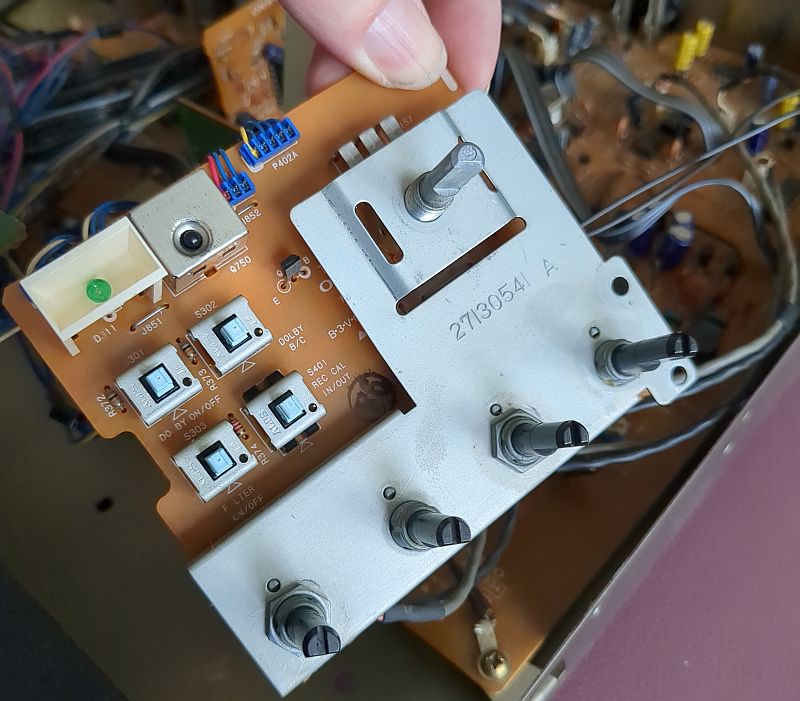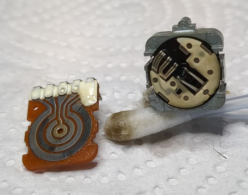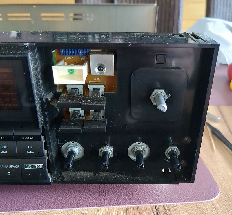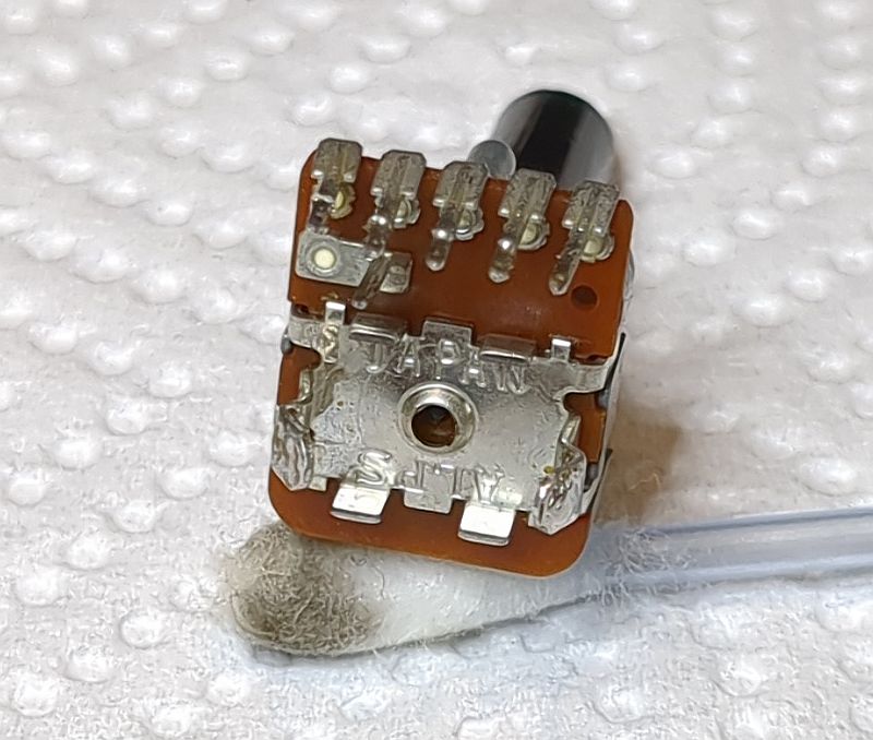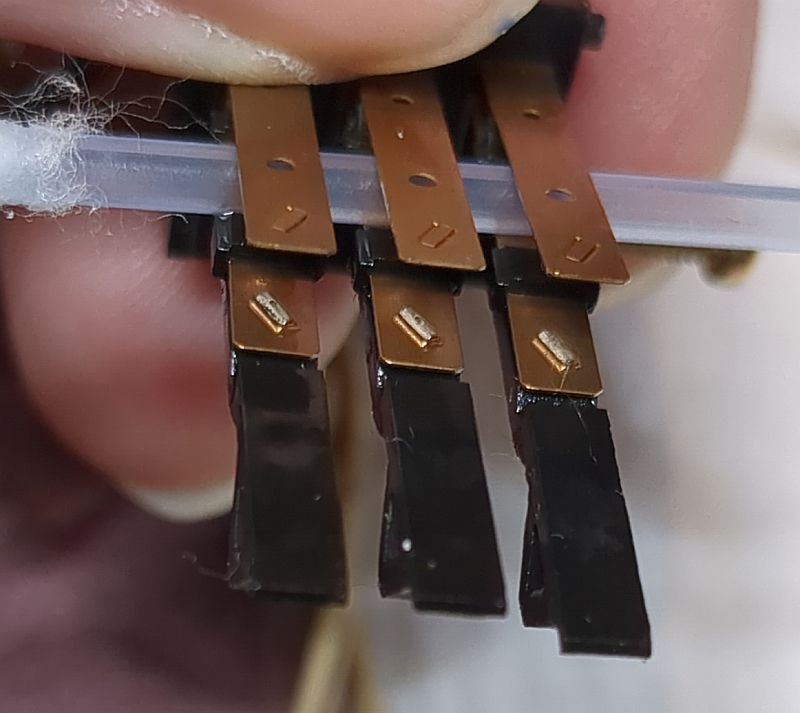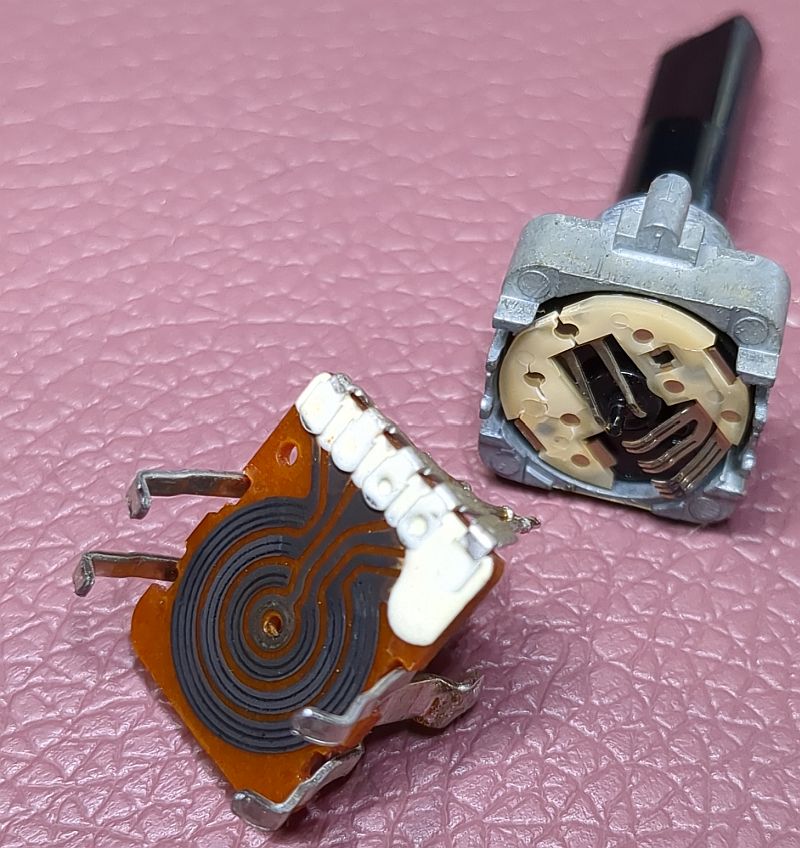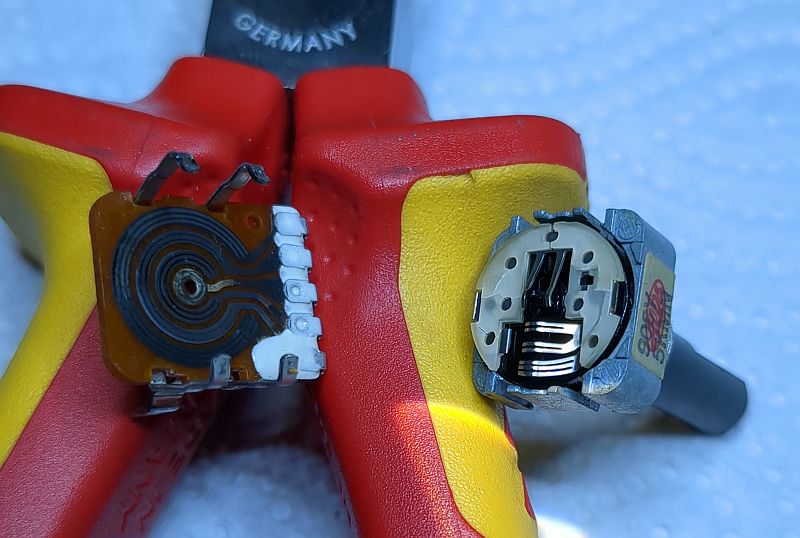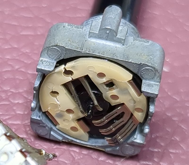 | Problem | Nach langer Standzeit verweigerte mein Tapedeck Onkyo TA-2570seinen Dienst. Tatsächlich hatte ich das Gerät viele Jahre nicht genutzt. Warum eigentlich nicht? Jedenfalls hatte ich meine Musik-Cassetten aus dem Keller hervorgeholt und wollte diese mal wieder durchhören. Aber das 2570 ging sofort in den Fehlermodus... Es lag natürlich die Vermutung nahe, dass „nur“ der Antriebsriemen hinüber war und ersetzt werden müsste. Dass doch etwas mehr zu tun war, zeigt zunächst das unten verfügbare Video, welches die Reparatur zusammengefasst zeigt. Aus über drei Stunden Videomaterial habe ich mal gut 45 Minuten zusammengeschnitten... (das Video kann mit dem zweiten Schalter von rechts vergrößert werden) Die nachfolgenden Fotos sollen die Reparatur sozusagen nochmals „bildlich“ darstellen und das Video ergänzen. Zum Verständnis sollte das Video also vorher angesehen werden. Mit Klick auf die Fotos werden diese in voller Auflösung angezeigt. Hier sehen wir das ausgebaute Laufwerk von vorne. Es fehlen der Wickelmotor, die Wickel und die Capstans (Tonwellen): Hier schauen wir von oben in das Laufwerk und auf die Tonköpfe. In der Mitte sehen wir ein Lämpchen, welches die Hintergrundbeleuchtung der Cassette übernimmt. Damit nichts wegkommt, werden alle Einzelteile in einer Aufbewahrungsbox einsortiert: Auch der der Wickelmotor und die Flywheels (Schwungmassen mit den Tonwellen) werden in einer Kiste aufbewahrt: Hier sehen wird das Laufwerk von hinten. Der Motor links betätigt den Kopfschlitten und die Laufwerksfunktionen. Der größere Motor rechts betreibt den Antriebsriemen, der auf die Flywheels wirkt. Das Laufwerk mit wieder eingebautem Wickelmotor, Wickelteller und Capstans. Auch der Back-Tension-Riemen ist bereits montiert. Ein Blick von oben auf die Wickelmotorwelle und die Ritzel. Das passt so... Alles greift schön ineinander: Auf diesem Foto sind die Flywheels bereits wieder eingesetzt: Allerdings musste der Wickelmotor erneut ausgebaut werden, da er doch noch nicht richtig lief und daher zerlegt werden musste. Auf diesem Detailfoto sieht man deutlich den verschmutzen Kommutator und die verschmutzen Federgleiter (gerne mal auf's Foto klicken!): Die Lauffläche sieht wahrlich nicht (mehr) gut aus:Nach der Reinigung mit Politurpaste für Autolacke und mechanischer Reinigung mit einem Glasfaserradierstift sehen die Kontakte wieder sehr gut aus! Der Kommutator wurde ebenfalls mit Lackpolitur behandelt; den Radierstift habe ich aber nicht verwendet, da ich gobe Riefen befürchtete. Daher ist der Kommutator auch nur semi-sauber geworden. Die Abdeckplatte ist lediglich mit zwei Schrauben befestigt (oben links und rechts): Im Video habe ich die Ertüchtigung der Reflexionsfelder auf der Rückseite der Wickelteller nicht gezeigt, weil dies „filmisch“ ziemlich uninteressant gewesen wäre. Der Input-Level-Regler (der einzelne neben den Tasten) hingegen ließ sich geräuschlos bewegen. Die beiden Rec-Level-Regler unter den Tasten wurden „vorsichtshalber“ ebenfalls in die Wartung aufgenommen (das ist aber unnötig, denn diese Potis wirken sich nicht bei der Live-Wiedergabe aus, sondern stellen bei der Aufnahme lediglich das Eingangssignal ein). Dazu musste die Frontplatte des Decks abgenommen und die Platine aus dem Chassis entnommen werden... ...und die einzelnen Potentiometer aus der Platine ausgelötet werden: So sieht also ein Poti von Innen aus: Hier ein Detailfoto der Schleifer. Diese (und nicht die dunklen Graphitlaufbahnen) sind das Problem!Wie man sieht, ist der Dreifach-Schleifer deutlich oxidiert (und auch die auf dem Foto von oben kommende "Gabel" hat schwarze Kontaktflächen): Nach der Reinigung sehen die Federkontakte wieder gut aus und können das Signal "kratzfrei" weiterleiten: Das Poti von der Lötseite (alle Potis stammen von „Alps Japan“): Zum Öffnen der Potis müssen vier Metallklammern, die die Platine an das Gußeisenteil pressen, aufgehebelt werden:Wenn die eine Seite der Klammer aufgehebelt ist, geht der Rest einfach von statten: Auch die anderen Potis wurde auf diese Weise zerlegt und gereinigt.Nach der Reinigung sehen auch diese Federkontakte wieder gut aus: Aber auch die Schleifbahnen weise etwas "Schmutz" auf, der jedoch leicht abgewischt werden kann: |