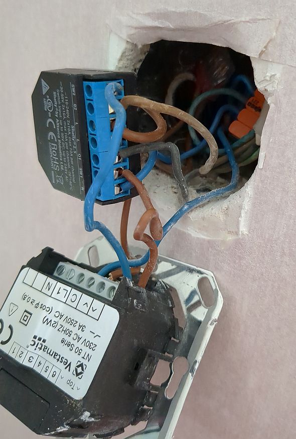 | Problem | Nach einigen Jahren (genau genommen waren es nur drei!) gingen so langsam meine Rollo-Aktoren Shelly 2.5) kaputt. Die WLAN-Verbindung kam ab etwa Mitte September 2024 nicht mehr zustande und die Rollos ließen sich nicht mehr schalten (also hoch- und herunterfahren). Aus dem Aktor selbst kam dabei durchgehend ein zischendes / rauschendes Geräusch. Unter auf dem Foto sieht man, dass der Aktor zwischen den eigentlichen Rollo-Schalter "eingeschleift" wird. Er sitzt also in der Unterputzdose hinter dem Schalter, mit dem die Rollos auch „von Hand“ bedient werden können. Aber wenn der Shelly nicht mehr mag, werden auch die Schaltsignale des Schalters nicht mehr durchgeschleift... (oder sagt man: durchgeschliffen?)