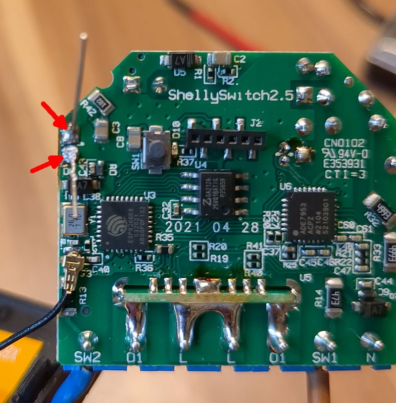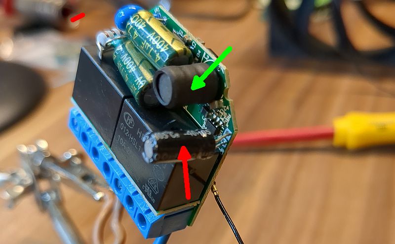 Glücklicherweise gibt es in Deutschland lebendige Shelly-Foren, in denen ich schnell auf einen defekten Kondensator hingewiesen wurde. Tatsächlich hätte Shelly diesen Elko auf deren Kosten ausgetauscht, da wohl einige Zeit qualitätiv minderwertige Elkos verbaut worden waren. Aber dann hätte ich den Aktor nach Bulgarien senden müssen, da ich ihn seinerzeit auch dort direkt über den Hersteller (damals noch Allterco) bezogen hatte. Das war mir dann doch zu aufwendig! Obwohl das Rauschen von der Spule (grüner Pfeil) herrührte, war der Elektrolytkondensator (roter Pfeil) der Spielverderber! Auf dem Foto habe ich den Elko schon mal aufrechtgestellt (er liegt eigentlich neben der Spule), damit er besser zu sehen ist. Eigentlich hätte dieser 100µF-Elko als 105°C-Variante standhafter sein sollen, dennoch hat er schlapp gemacht. Leider ist Ersatz (100µF / 16V) gar nicht so leicht zu finden; jedenfalls nicht in der hier benötigten Größe, denn ich habe nur Elkos gefunden, die dicker sind und somit nicht neben die Spule passen. Aber auch hier war mir ein Forumskollege behilflich (Danke Thomas!), der mir passenden Ersatz in Polymerausführung zugesandt hat. |