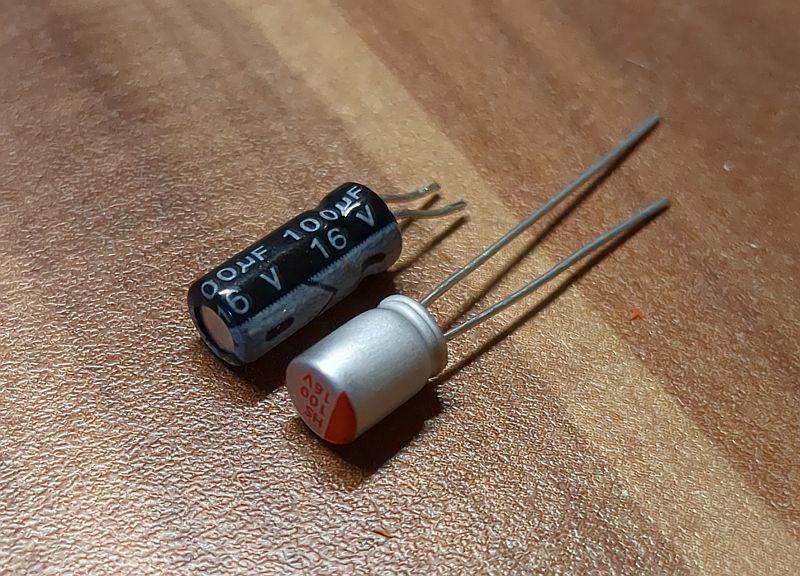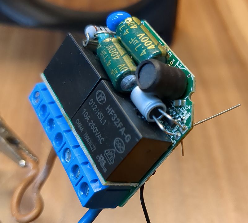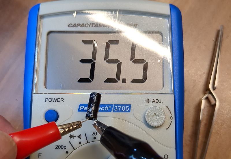 Tatsächlich hatte der altersschwache Elko nur noch 35% seiner Nominalkapazität (35,5 µF statt 100 µF): Hier sieht man den bereits eingebauten und „flachgelegten“ Polymerkondensator in seiner Endlage (die „Beinchen“ unter der Platine sind noch nicht abgeknipst): Die noch nicht abgeknipsten „Beinchen“ und die Platine von unten (ein Wunder, dass man an einem Elektronik-Modul aus dem Jahr 2021 überhaupt noch selbst etwas reparieren kann!): Im Verlauf der nachfolgenden Wochen sind dann auch noch weitere drei (von fünf) derartiger Aktoren mit den gleichen Symtomen auf meinem Werktisch gelandet! Alle verrichten nun wieder klaglos ihren Dienst (einer davon sogar weiterhin mit dem Original-Elko!!!). | |